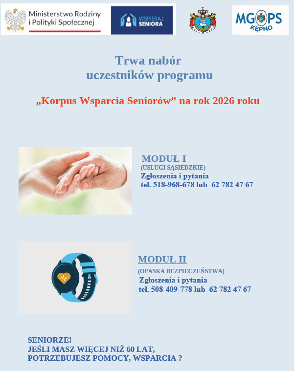 Miejsko – Gminny Ośrodek Pomocy Społecznej w Kępnie zaprasza seniorów w wieku 60 lat i więcej, mieszkających w mieście i gminie Kępno, mających problemy z samodzielnym funkcjonowaniem ze względu na stan zdrowia, prowadzących samodzielne gospodarstwo domowe lub mieszkających z osobami bliskimi, które nie są w stanie zapewnić im wystarczającego wsparcia, do skorzystania z programu Korpusu Wsparcia Seniorów.