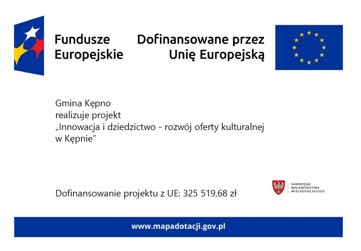 Projekt pn. „Innowacja i dziedzictwo - rozwój oferty kulturalnej w Kępnie” jest współfinansowany ze środków Europejskiego Funduszu Rozwoju Regionalnego (EFRR) w ramach programu Fundusze Europejskie dla Wielkopolski 2021–2027, Priorytet 8: Rozwój Lokalny Kierowany przez Społeczność (EFRR), Działanie 8.1 Wspieranie rozwoju programowanego w Lokalnych Strategiach Rozwoju (RLKS).